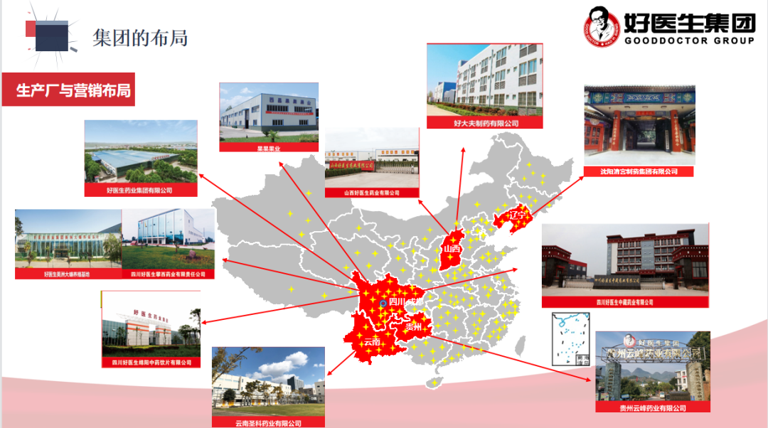 好医生药业集团成立于1986年,经过36年的发展,已成为集科、工、贸为一体,以生物制药为核心,“大健康”产业全面发展的大型企业集团。集团业务分布在医药工业、医药商业、医疗服务、中药材基地、医药研发、日化工业六个版块,产业主要分布在四川、辽宁、云南、山西。